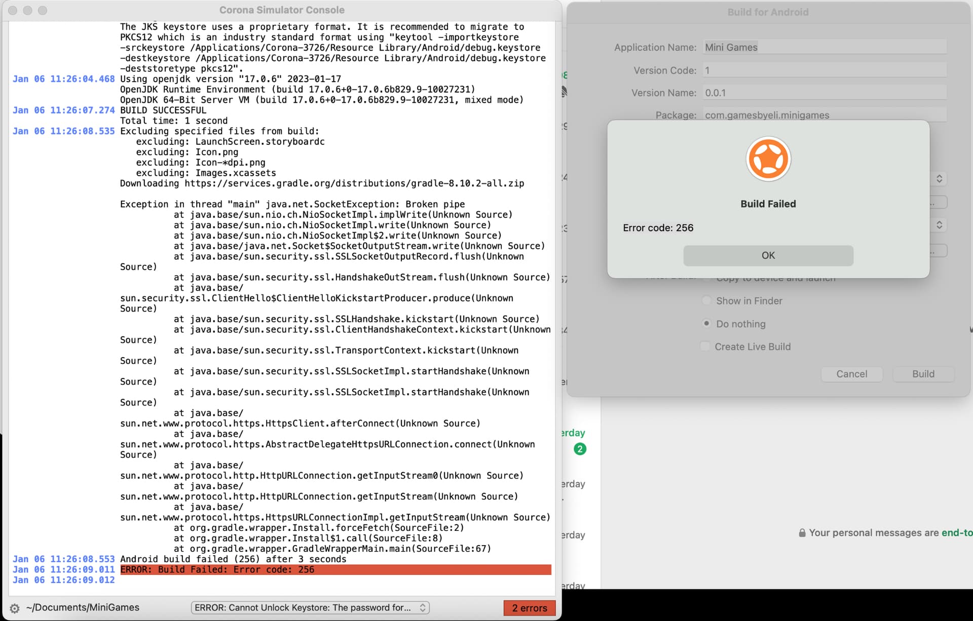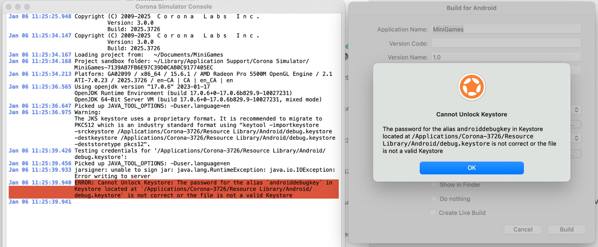 The password for the alias androiddebugkey in Keystore located at /Applications/Corona-3726/Resource Library/Android/debug.keystore is not correct or the file is not a valid Keystore