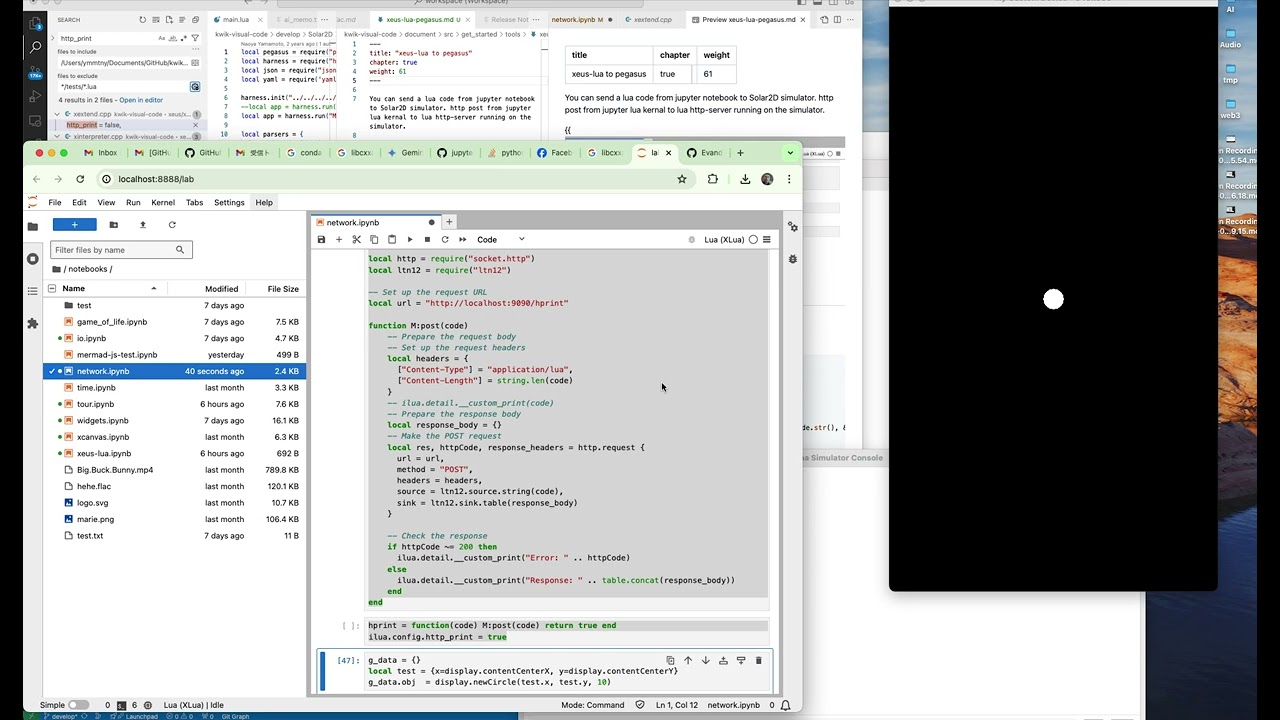 I was curious about Jupyter kernel for Lua called xeus-lua. It is using ilua. I though it can send a lua code from jupyter notebook to Solar2D simulator via http protocol. I added a little code to xeus and tested http post from xeus to lua http-server pegasus running on the simulator. It worked.