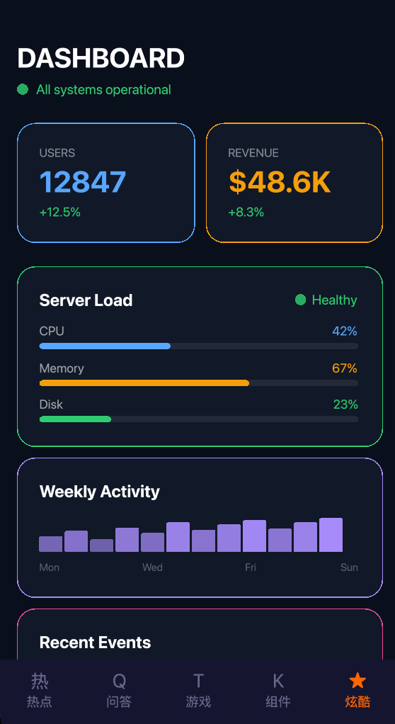 Full CSS Flexbox layout computation — flex-direction, justify-content, align-items, flex-grow/shrink, gap, aspect-ratio, percentage sizing, and more.