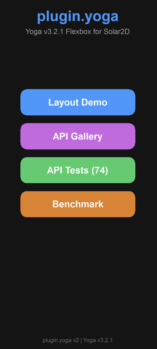 I’ve released plugin.yoga — a native C plugin that brings https://yogalayout.dev/ (CSS Flexbox) layout to Solar2D.